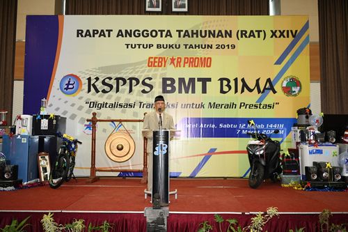 MAGELANG-Rapat Anggota Tahunan (RAT) ke XXIV Tutup Buku Tahun Buku 2019, Koperasi Simpan Pinjam dan Pembiayaan Syariah Baitul Maal Wat Tamwil Bina Insan Mulia (KSPPS BMT BIMA) dibuka oleh Deputi Bidang Kelembagaan Kementerian Koperasi dan UKM RI, Rully Nuryanto SE di Hotel Atria Magelang, Sabtu (7/3). Deputi Bidang Kelembagan dalam sambutannya mengimbau koperasi merangkul anak-anak muda sebagai kaum milenial. Pasalnya koperasi dianggap badan usaha yang ketinggalan jaman.”Kami harap koperasi dapat menjadi salah satu badan usaha yang diminati anak-anak muda apalagi koperasi memiliki anggota seperti halnya sebuah komunitas,”ujarnya.